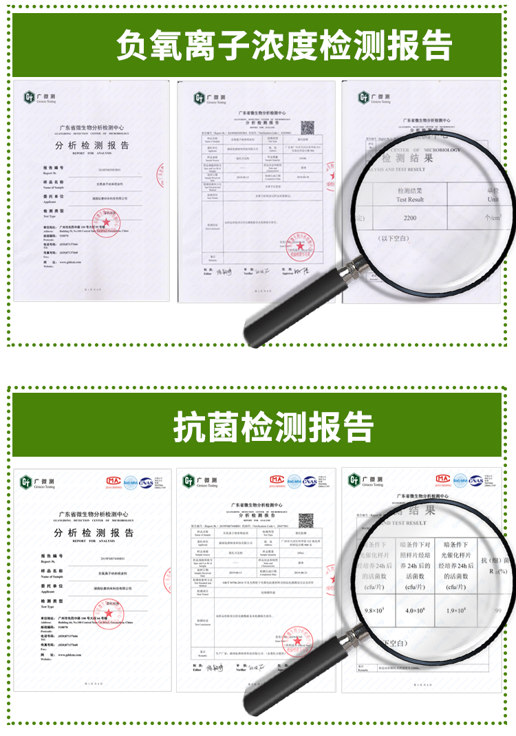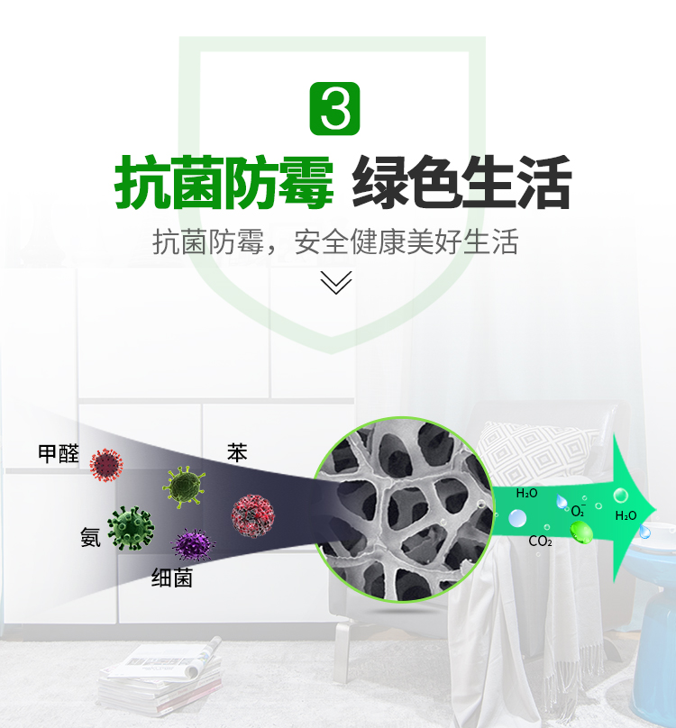 產(chǎn)品可以有效降低空氣中PM2.5濃度;降解空氣中有毒害氣體(如甲醛、苯、TVOC 等);抗菌率大于98%。
